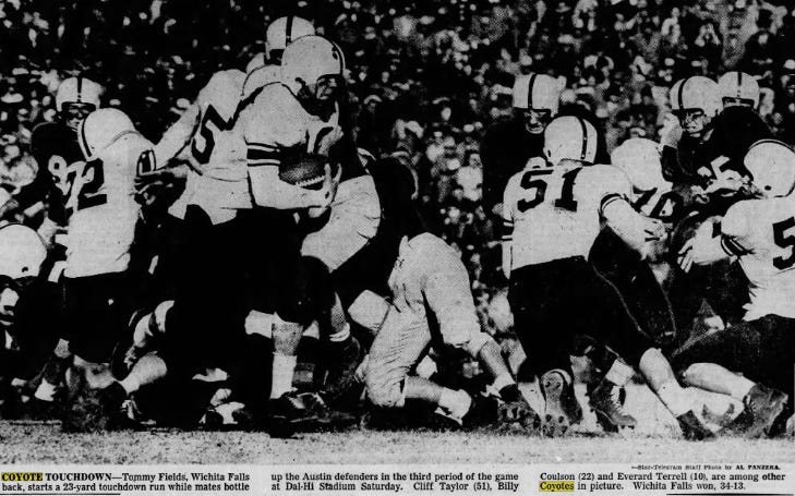 Interesting tidbits from my 1950 Coyote researchMore thoughts and facts that I couldn't fit into my story on the unlikely champions Zach DuncanDec 31, 2025∙ Paid51ShareThis photo has Tommy Fields scoring the go-ahead touchdown in the 1950 title game against Austin. First off, I hope everyone has an enjoyable and safe New Year’s Eve.Secondly, I had been planning on …Continue reading this post for free, courtesy of Zach Duncan.Claim my free postOr purchase a paid subscription.
